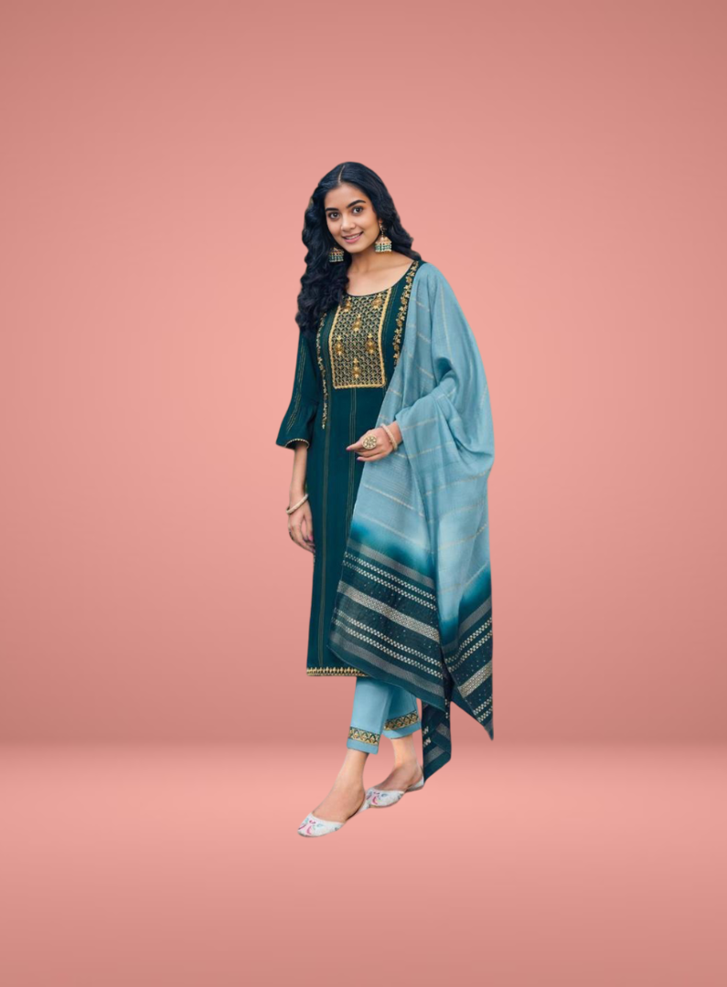Indubalaa Deep Green Embroidered Viscose Rayon Kurti Set