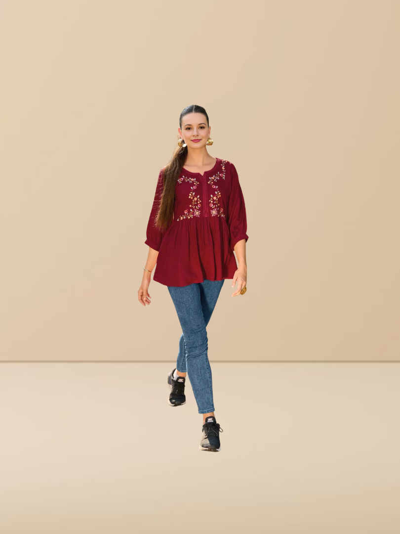 Indubalaa Baby Pink Embroidered Viscose Rayon Short Kurti